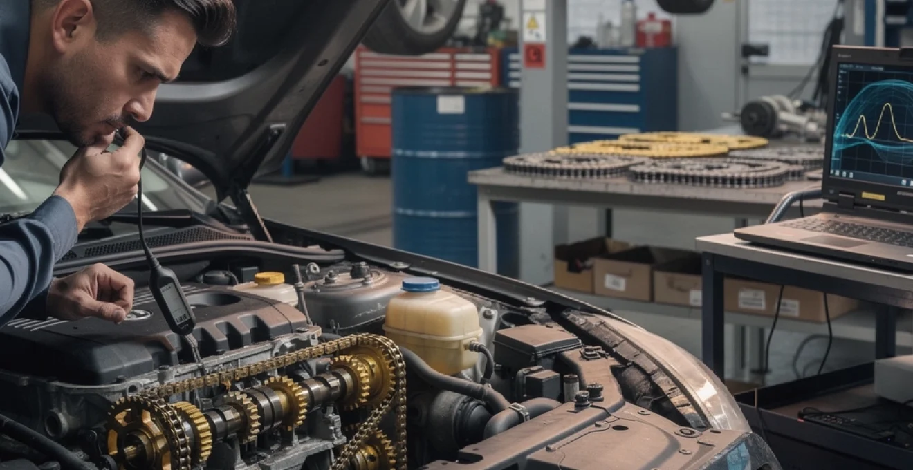 Le premier outil de diagnostic reste votre oreille. Un bruit de chaîne de distribution qui inquiète se manifeste le plus souvent par un cliquetis métallique régulier, perceptible au ralenti, surtout à froid. Ce cliquetis suit le régime moteur : plus vous accélérez, plus la fréquence des coups s’accélère, comme un métronome qui s’emballe.